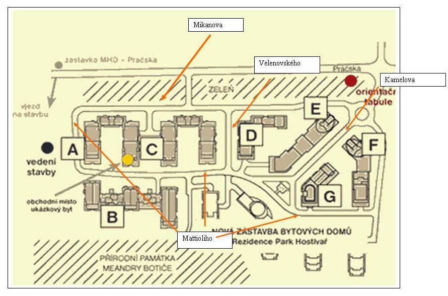 | Ještě jednou nějak jsem se zamotala: Mikanova podél džungle, Kamelova jižně od kruhového objezdu mezi E a budoucími F,G, Velenovského mezi C a D a úplně na konci u stavebních buněk a džungle začíná Mattioliho, která vede mezi domy A,C a B. |