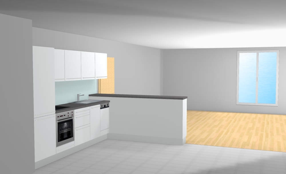 | Jinak jim tam chybeji v navrhu uchyty, program to nejak nezvlada. Trouba je niz polozena a mensi, kombinovana s mikrovlnkou. Mensi jsem zvolil, protoze nevarim a protoze vedle sklokeramicky desky s dvema plotynkama budu mit gril s lavovejma kamenama. Vedle trouby je mycka, neni to poznat, protoze jsem zvolil plne vestavenou, s ovladanim uvnitr. |