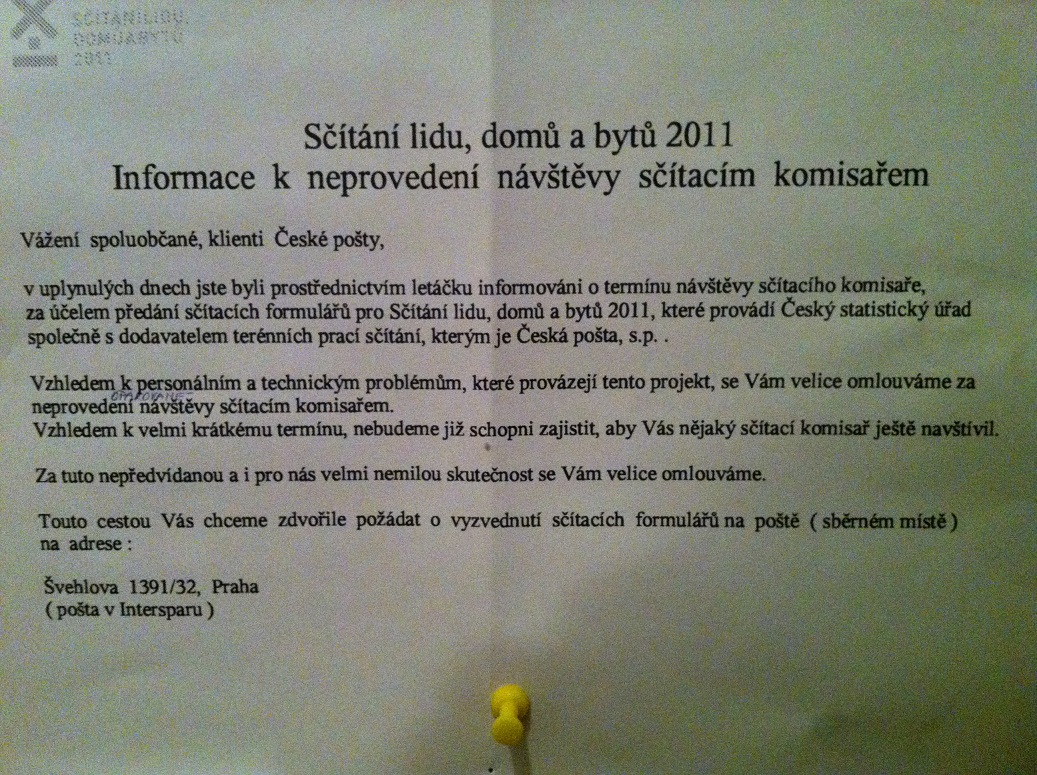 V pondeli jsem dostal listecek (ani se neobtezovala hodit ho do schranky a hodila ho na zem prede dvere), ze prej udajne u me byla v sobotu a podruhy v pondeli ... hm ... v sobotu jsem byl doma a nikdo nikde, a v pondeli prisla asi nekdy pres den, takze jsem samozrejme nebyl doma, no a ze si prej mam dojit pro ty formulare na postu do sparu ...