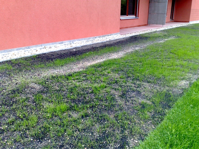 - dešťová voda z balkonů hloubí na zahrádkách strouhy, kde nic neporoste (pruh písku na fotce)