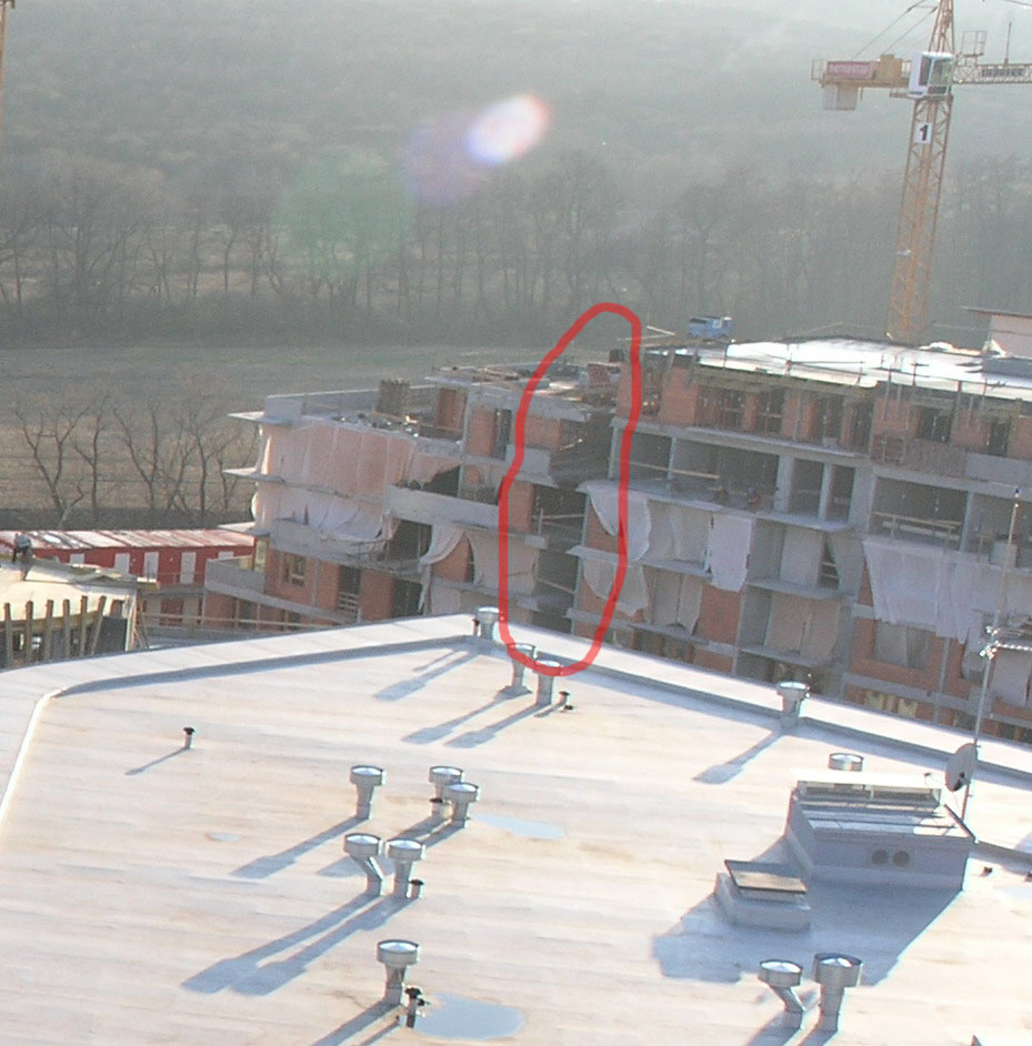 | Lepsi foto bohuzel nemam (foceno ze vzoroveho bytu v dome E), ale mnohem lepe je to videt z druhe ztrany z cesty od domu B (jelikoz je to probourano skrz celou sirku domu). |