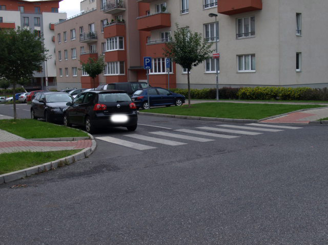| Zde černý VW parkuje před přechodem, v protisměru a ještě u plné čáry. Vozidlo bude v září odtaženo. Pokud nějaký řidič srazí na přechodu chodce, viník (podle Policie) nebude ten řidič, ale majitel tohoto vozidla, který zde takhle zaparkoval. |