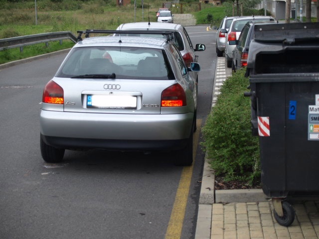 | Parkování na žluté čáře a není dodržen boční odstup 3 metry od plné čáry. Z tohoto místa u výjezdu z domu IJK bylo odtaženo již mnoho vozidel. |